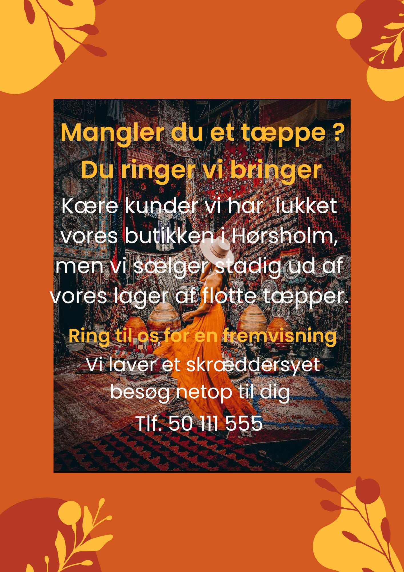 Kære kunder vi harlukket vores butikken i Hørsholm, men vi sælger stadig ud af vores lager af flotte tæpper.